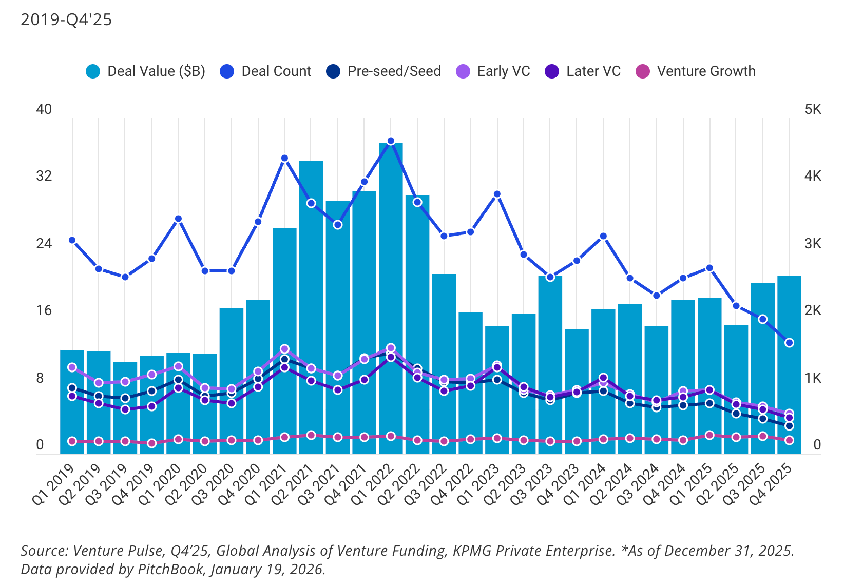European VC hit $85.3B across 8,626 deals in 2025—third-strongest year by capital but second-lowest deal count in a decade. Q4 saw $20.7B across 1,651 deals. Capital concentrated in fewer, larger rounds: Revolut ($3B), Oura ($907M—largest healthtech raise ever), Brevo ($578M). UK led with $6.8B, followed by Germany, France, Israel. Investor focus shifted to AI application layer (Black Forest Labs $300M, Synthesia $200M) and defense tech amid geopolitical tensions. Geographic diversity strong—top 6 megadeals spread across 6 countries.